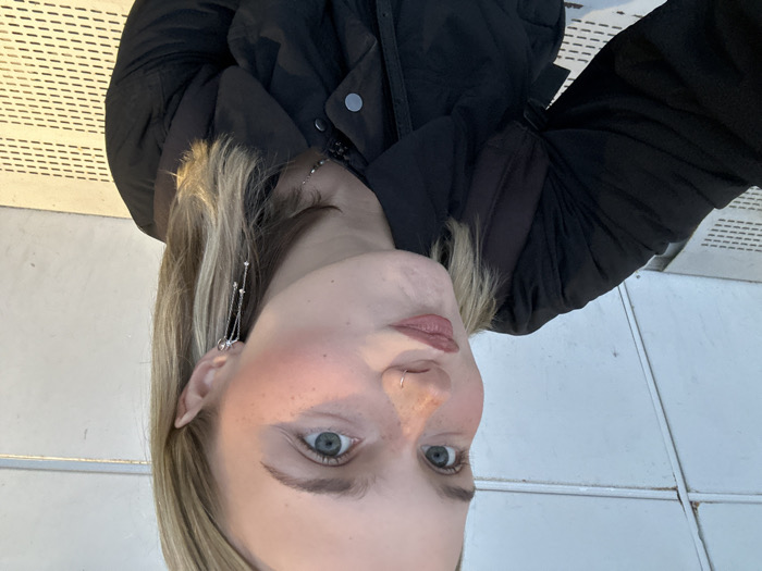 A woman takes a selfie outdoors, angled downward towards the camera. She has blonde hair, blue eyes, and fair skin with freckles on her nose. She is wearing a black puffer jacket and long silver earrings. She has a nose ring. The background consists of a white surface with linear patterns.