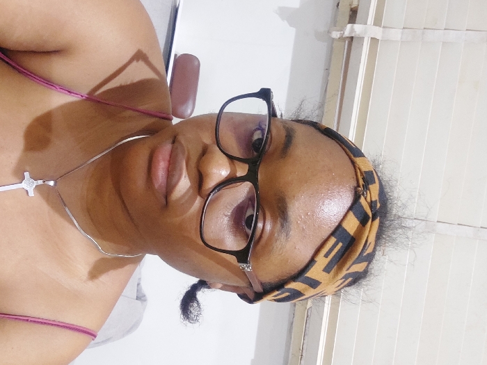 A light-skinned woman wears glasses and a patterned headband. She has a silver necklace with a cross pendant. The strap of her top is visible. The background includes a white wall, a small brown object, and a door. Her expression is neutral, with a slight shine on her forehead. Her hair is dark and partially tied back. The photo appears to be taken indoors.