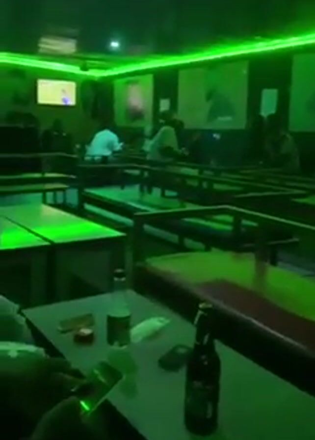 interior of a bar or lounge. There are several rows of empty tables and chairs with green, blue, and red lighting illuminating the space at different times. People can be seen sitting or standing at some of the tables, drinking and conversing. There are bottles of beer and phones on some of the tables. The background includes artwork and televisions. The lighting color shifts throughout the video. Some people are walking through the room.