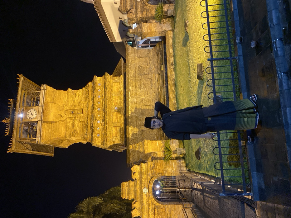 A nighttime photograph taken in Kauman, Indonesia, features a male individual standing on a wet pavement in front of a prominently illuminated, multi-tiered brick clock tower