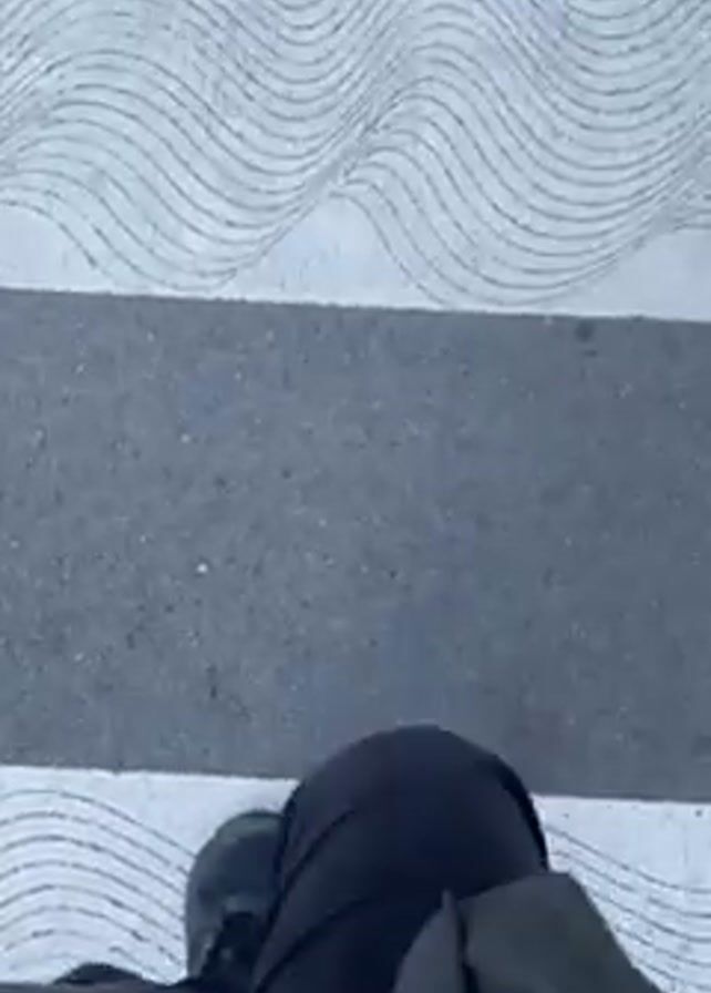person walking across a crosswalk with a distinctive wavy line pattern on the white painted stripes. The person is wearing dark pants, a dark jacket or hoodie, and dark shoes. At one point, a green vest is briefly visible. The crosswalk leads to a sidewalk or other paved area that has tactile paving.