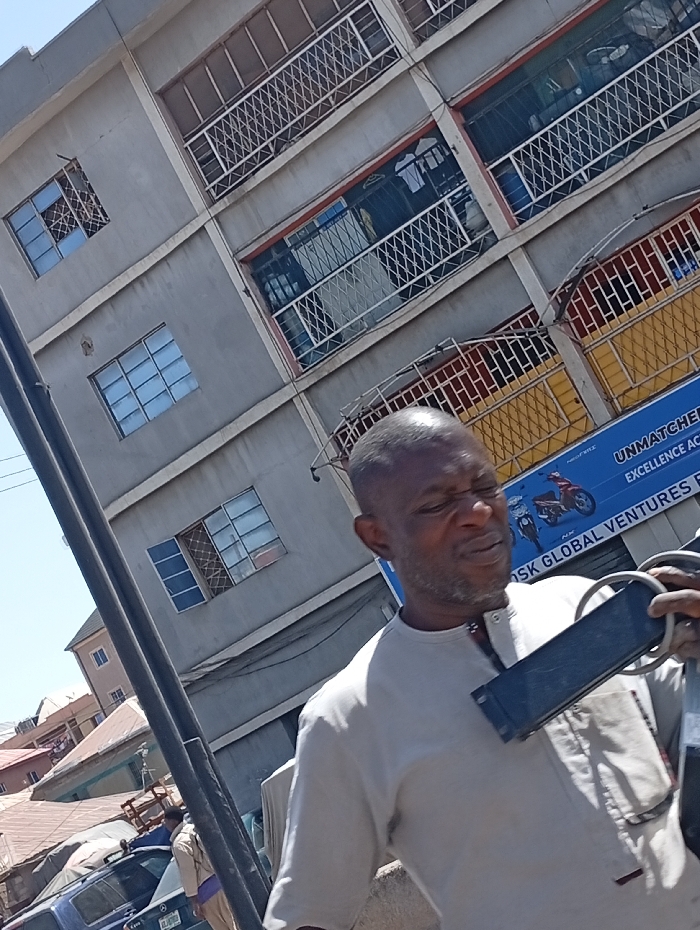 An outdoor scene in Sabon Gari East, Nigeria, depicts an adult male in the foreground, positioned slightly to the right of the frame