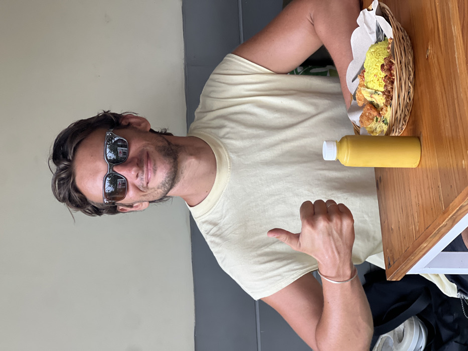 An adult male is seated at a light brown wooden table, posing for a photograph in what is described as a casual dining establishment in Ungasan, Indonesia. The subject, appearing Caucasian and estimated to be between 25 and 35 years of age, has medium-length brown hair. He is wearing dark, reflective rectangular sunglasses with a grey frame, and a light yellow, sleeveless t-shirt. A thin silver bracelet is present on his left wrist. He is smiling and looking directly at the camera, with his left hand raised in a thumbs-up gesture. On the table in front of him, to his right, stands a clear yellow plastic bottle with a white screw-top cap. Adjacent to the bottle is a woven basket containing a meal, which consists of yellow rice (Nasi Kuning), several pieces of fried food, a portion of scrambled egg or omelet, and a dark brown, granular condiment. A metal spoon and fork are partially visible, wrapped in white paper, within the basket. The immediate background features a plain light beige wall, with a horizontal dark grey panel running along its lower section. Reflections visible in the sunglasses indicate outdoor foliage and portions of a red and white sign or building structure.