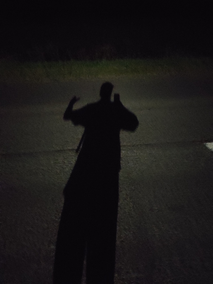 A nighttime scene is depicted outdoors in the city of Unknown, Unknown. The central and lower frame are dominated by the elongated shadow of a single individual cast upon a dark, textured asphalt surface. The shadow shows the person holding a mobile phone in their right hand, with their left hand raised, forming a gesture with two extended fingers (index and middle). A faint white line, consistent with road markings, is visible on the asphalt in the lower right quadrant. Above the asphalt in the mid-ground, a narrow horizontal band of dimly illuminated green vegetation, likely grass, is present, transitioning into a dark, indistinct background at the top of the frame. The length and angle of the shadow suggest a low-angle light source projecting from behind the individual.