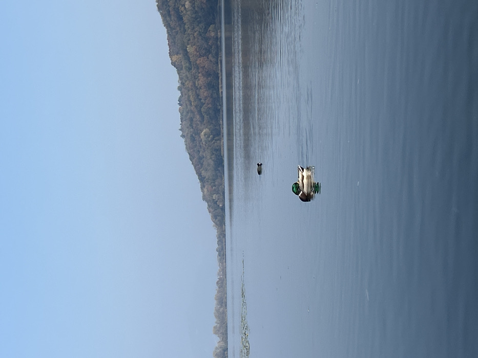 The image displays a scene on Lake Alserio in Alserio, Italy. The upper half of the frame shows a clear, light blue sky. The lower half features a body of water, exhibiting subtle ripples. In the mid-foreground, a male mallard duck (Anas platyrhynchos) floats, characterized by its iridescent green head and neck, white collar, and gray-brown body; its head is tucked backward, resting on its back. Further back and slightly to the right of the mallard, a smaller, dark-colored bird, identifiable as a Eurasian Coot (Fulica atra) with a distinctive white frontal shield, floats on the water. The background reveals a tree-covered hillside on the right, displaying varied autumn foliage, sloping down to the water's edge. A more distant, flatter shoreline with sparser, lighter-colored trees is visible on the far left. A cluster of aquatic vegetation, resembling lily pads, is present on the water's surface near the left edge of the frame. No human subjects or direct interactions are visible.