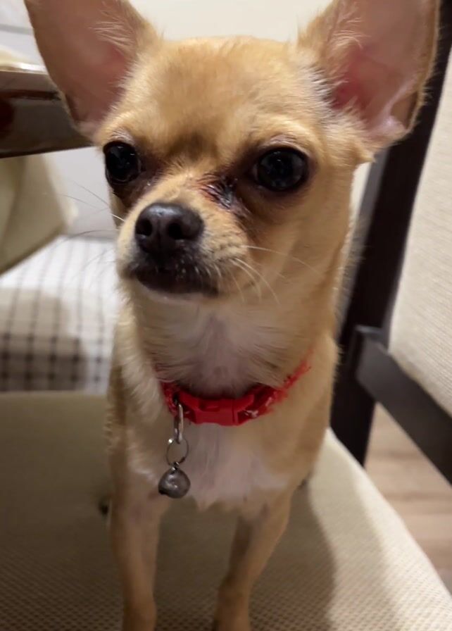 small, tan Chihuahua standing on a chair. It is wearing a red collar with a small, silver bell attached. The dog blinks and seems to look around with a slightly unfocused gaze. The background includes a dining table and a checkered couch or cushion.