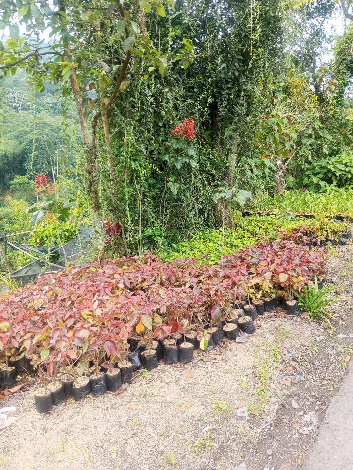 The image depicts an outdoor plant nursery or horticultural plot located in a rural or semi-rural area within the city of Unknown, Vietnam. In the immediate foreground, a light brown dirt path, textured with small aggregate, occupies the right side of the frame. To the left of this path, hundreds of young plants, approximately 15-30 cm in height, are neatly arranged in multiple rows. Each plant is contained within an individual black plastic bag or pot, and their foliage predominantly exhibits reddish-brown to maroon coloration, with some green and yellowish leaves intermixed. Beyond these potted plants, the midground transitions into a dense expanse of lighter green ground cover and shrubbery. To the far left, a dark mesh or fabric net, possibly part of a shade structure or cultivation area, is partially visible. The background is dominated by a wall of lush, verdant tropical vegetation, consisting of mature trees with visible trunks and an abundance of climbing vines. Two distinct clusters of vibrant red flowers are present: one prominently situated among the central background foliage and another smaller cluster further to the left. The distant background reveals layers of hazy green hills, indicating a valley or sloping terrain. No human or animal subjects are visible. The scene is illuminated by natural, diffused daylight.