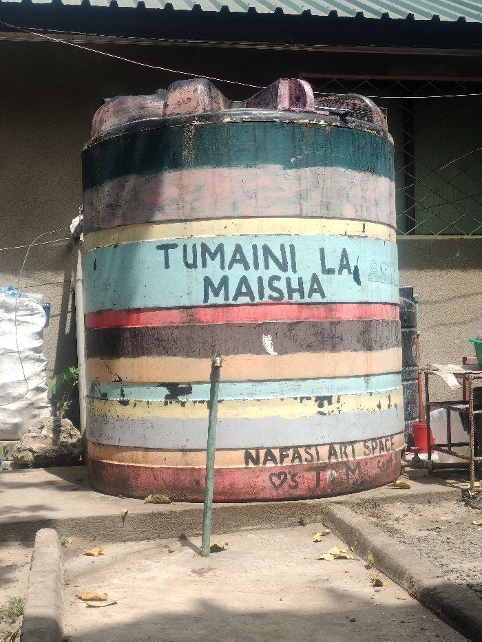An outdoor scene in Dar es-Salaam, Tanzania, depicts a large, vertically oriented cylindrical water storage tank, likely situated at Nafasi Art Space