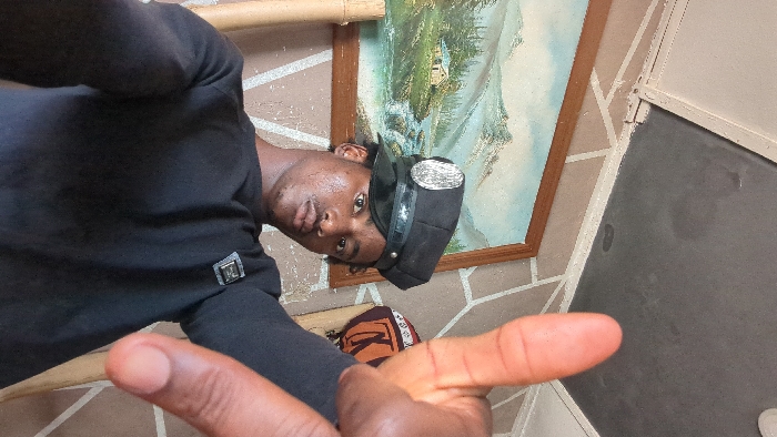 young adult Black male indoors, located in Rido, Nigeria. He is positioned centrally, looking directly into the camera. He wears a black long-sleeved shirt featuring a small, square, metallic emblem on the left chest, and a black peaked cap adorned with a large, circular, silver-toned badge on the front. His right arm is raised, with the index finger extended upward and forward towards the camera. The background consists of a wall with a light-colored, geometric pattern. A framed landscape painting, depicting mountains, a winding river, trees, and a small building with a red roof, hangs on the wall. To the left, a vertical structure composed of light-colored, cylindrical segments is partially visible. To the right, a dark, fabric-covered object with a white letter (possibly 'K') is present. The upper portion of the image shows a segmented ceiling, featuring both a light panel and a darker grey section with visible stains.