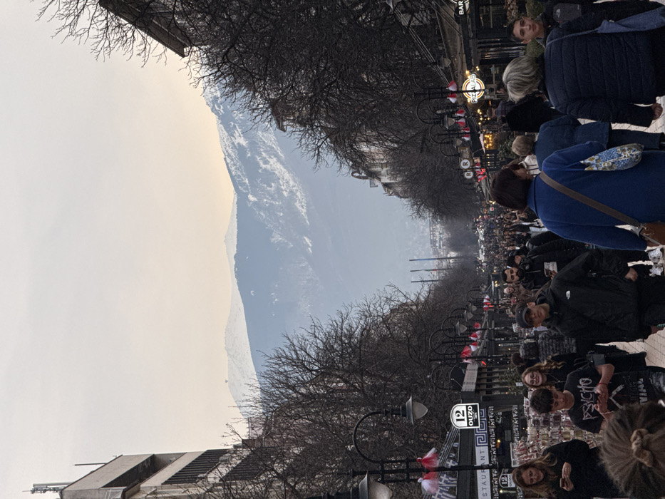 The image depicts a crowded pedestrian street, Vitosha Boulevard, in Sofia, Bulgaria, looking south towards the snow-capped Vitosha Mountain