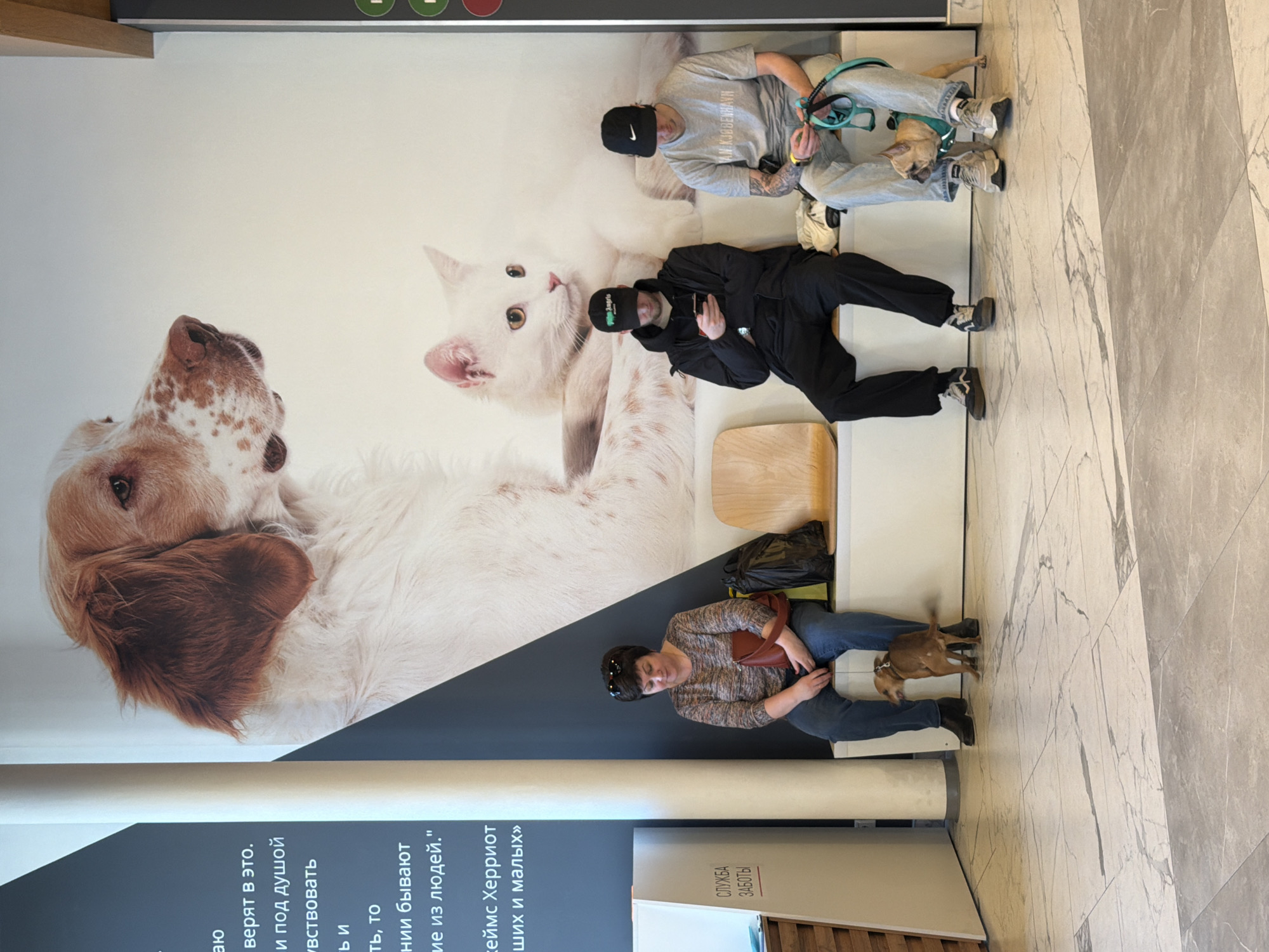 Here is a detailed description of the image: **Scene:** The image shows three people and two dogs sitting on benches in what appears to be a public space. The background is a large advertisement poster featuring a dog and cat. **People:** * Two men in the upper portion of the image are wearing casual clothing and caps. One is in a gray top, while the other is wearing all black. * A woman is seated in the lower section. She has on a patterned top and jeans, holding a brown bag. **Animals:** * There is a smaller brown dog standing by the woman's legs. * A larger dog, in a green harness, is sitting with the man in the gray shirt. **Objects:** * Benches are arranged along the wall. * There is a black bag next to the woman. * The advertisement poster contains the images of a dog and cat, as well as Russian text. **Location Details:** * The OCR in the image suggests that the poster includes the phrase "СЛУЖБА ЗАБОТЫ", which translates to "Care Service" or "Customer Service." The text is in Russian. * The name "Джеймс Херриот" (James Herriot) is mentioned, and the bottom line states, "и малых" (meaning "small animals"), which suggests it may be a veterinary care service that is advertising. * There is no clear indication of a precise address or location within St. Petersburg itself. **Action and Interactions:** * The people are seated on the benches and seem to be relaxing. * The dogs appear to be pets that are accompanying their owners.