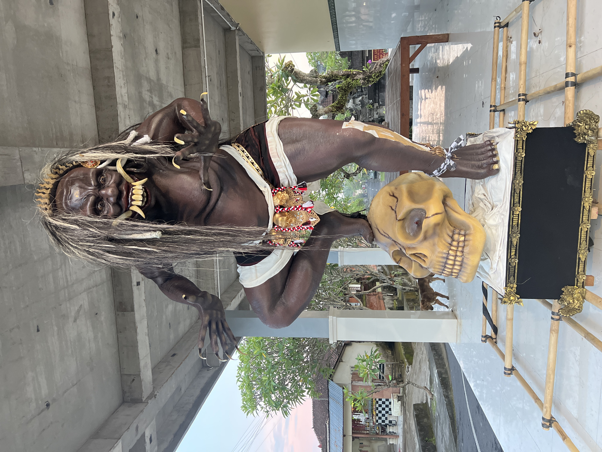 This image captures a large effigy, consistent with an Ogoh-Ogoh, situated in Celuk, Indonesia, beneath a concrete structural overhang