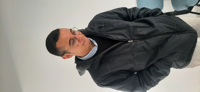 A male individual is depicted standing indoors in Meknes, Morocco, against a plain white wall. The subject, an adult with short dark hair, wears circular, thin-framed eyeglasses. He is dressed in a dark, zippered hooded jacket, layered over a dark crew-neck sweater and a light blue collared shirt. His hands are placed into the pockets of the jacket. The subject's head is tilted downwards, and his gaze is directed towards the floor. A light blue chair with a black frame is partially visible in the background to the right.