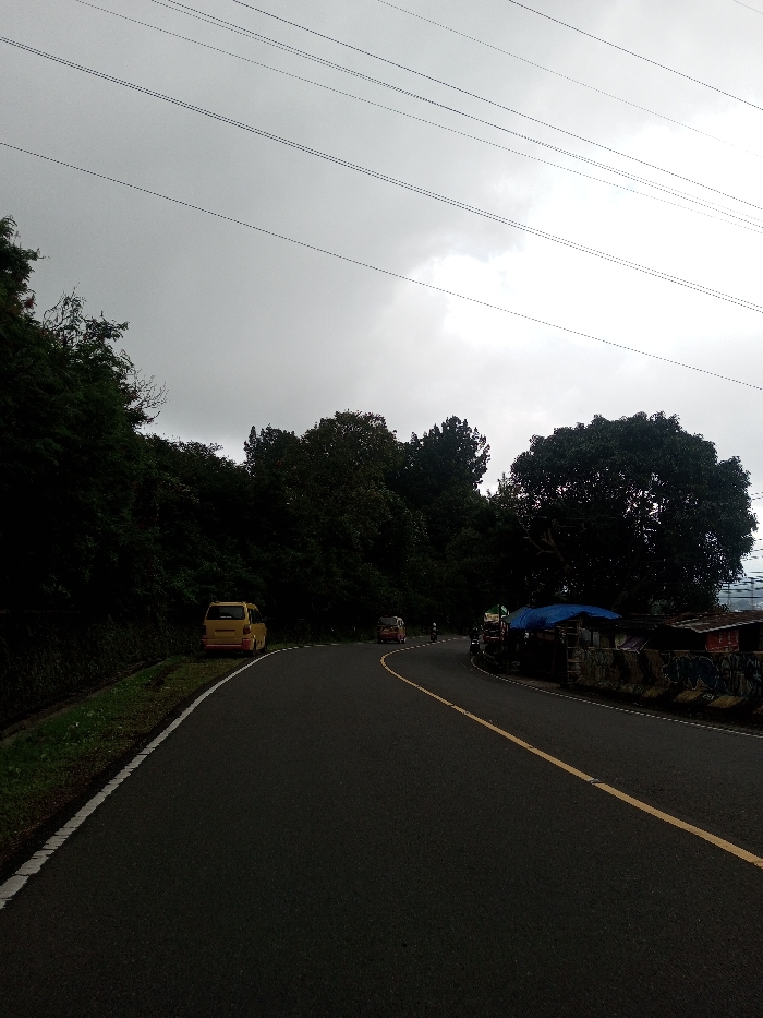 An overhead view depicts a curved asphalt road traversing a rural or semi-urban landscape in Deothang, Bhutan, under a heavily overcast sky. Multiple parallel power lines are visible spanning the upper portion of the gray sky. The road features a solid white line marking its left edge and a broken yellow center line. On the left side of the road, a narrow grassy verge leads to a steep embankment densely covered with dark green foliage and trees. A yellow minivan is parked on this grassy shoulder, facing away from the viewer, partially obscured by the vegetation. On the right side of the road, further along the curve, structures are present, partially covered by a blue tarp. Beneath these structures, a concrete barrier or wall displays faded markings or graffiti. Dense trees rise behind these structures. Several vehicles are visible on the road ahead: a light-colored van or small bus is moving away from the viewer in the right lane, and a motorcycle or scooter follows. A larger vehicle, possibly a truck, is parked near the blue-tarped structures. No individuals are clearly discernible.