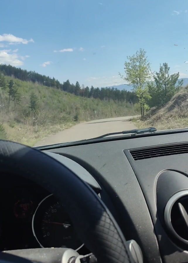 first-person perspective from inside a car driving on a narrow paved road. The road winds through a rural, hilly area with trees and some bare patches of land. The sky is blue with a few clouds. The dashboard and steering wheel of the car are visible. The driver's hand is briefly seen on the steering wheel.
