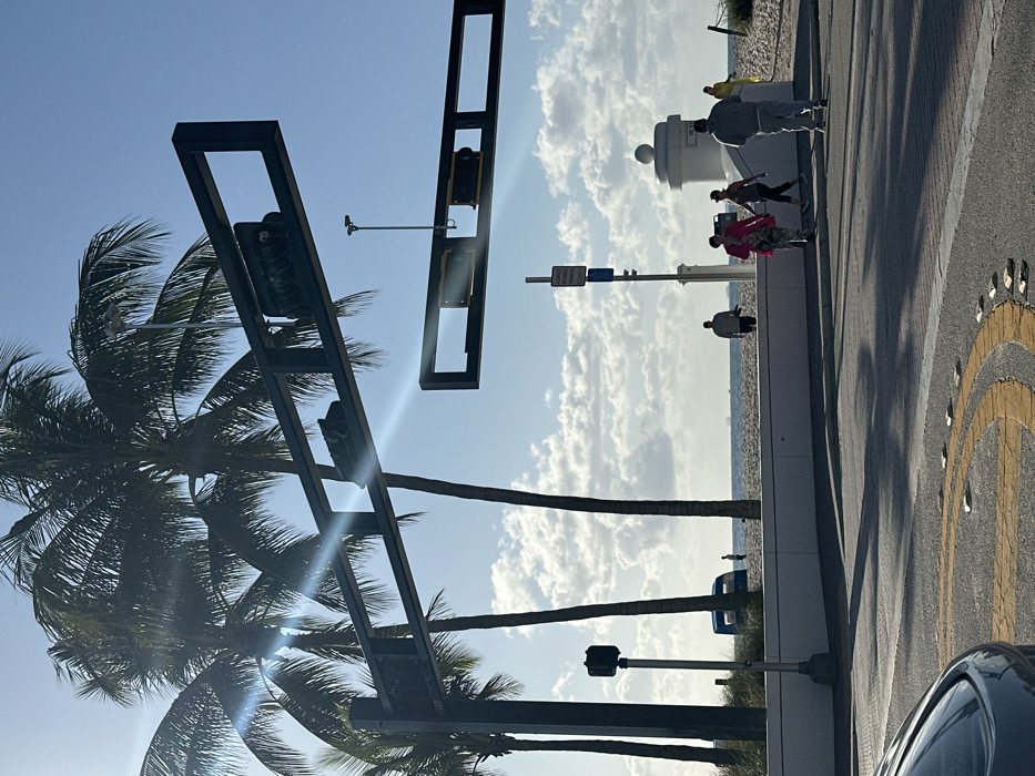 The image depicts a sunny daytime scene on North Atlantic Boulevard in Fort Lauderdale, Florida, facing east towards the Atlantic Ocean. The foreground shows a segment of an asphalt roadway with yellow painted curved lines and embedded reflective markers; a dark vehicle's fender is visible in the bottom left. Overhead, two dark, rectangular gantries span the road, equipped with traffic signal housings. Several tall palm trees with green fronds stand prominently, backlit by the sun, which causes a lens flare in the upper left portion of the sky. The sky is clear blue with scattered white cumulus clouds. A white concrete barrier or low wall separates the roadway from a wide, sandy beach. On the promenade, a light-colored pole displaying a blue sign and a white, cylindrical monument with a domed top are visible. In the mid-ground, five individuals are present on or near the promenade: one wearing a pink jacket and patterned pants, another in dark athletic attire, and a third in a bright yellow garment, along with two individuals in gray hoodies and pants, generally moving or standing. Further back on the beach, two indistinct figures are visible near the water's edge, close to a dark blue beach structure. On the distant horizon, several large ships are silhouetted against the bright sky over the Atlantic Ocean. Shadows from trees and overhead structures are cast across the roadway.
