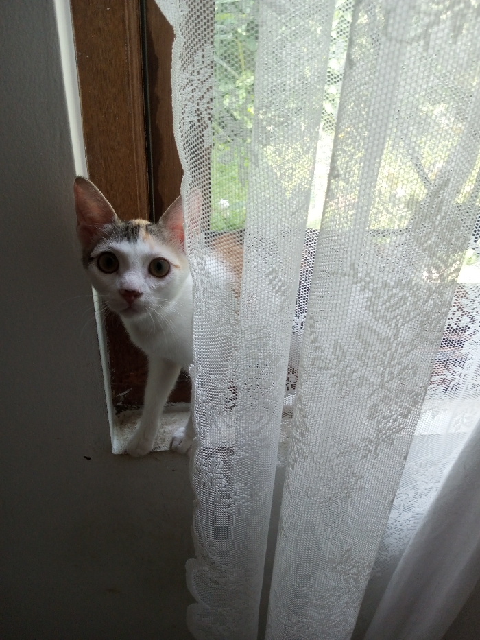 - "A curious cat peers from a window partially obscured by white lace curtains" by FM-4YnJo2, licensed under CC BY 4.0