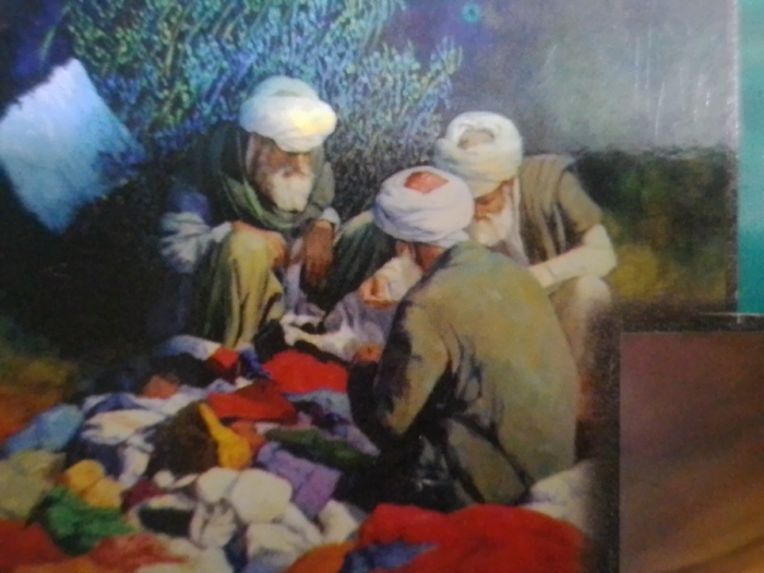This image is a stylized depiction, likely a painting or print, portraying three adult males in a shaded outdoor setting, specifically in Quetta, Pakistan. The three subjects are men, each distinguished by a white or off-white turban and a prominent white or grey beard. Their attire consists of traditional loose-fitting garments in muted earthy tones. The leftmost figure is seated or squatting, facing partially right, wearing a green shawl over his shoulders and light-colored pants. The central figure is seated with his back mostly to the viewer, clad in an olive-green garment and a white turban featuring a reddish band. The rightmost individual is seated or squatting, facing left towards the other two, dressed in light brown clothing. Centrally in the foreground, a substantial pile of textiles is spread directly on the ground. These fabrics display a variety of vibrant colors, including red, blue, purple, yellow, and green, appearing somewhat disorganized. The men are gathered around this pile, with their hands visible in proximity to the fabrics, suggesting interaction, possibly examining or sorting the items. The background consists of dark, dense foliage, indicative of trees or bushes, under what appears to be subdued or indirect lighting. The immediate ground surface beneath the men and textiles is unadorned earth.