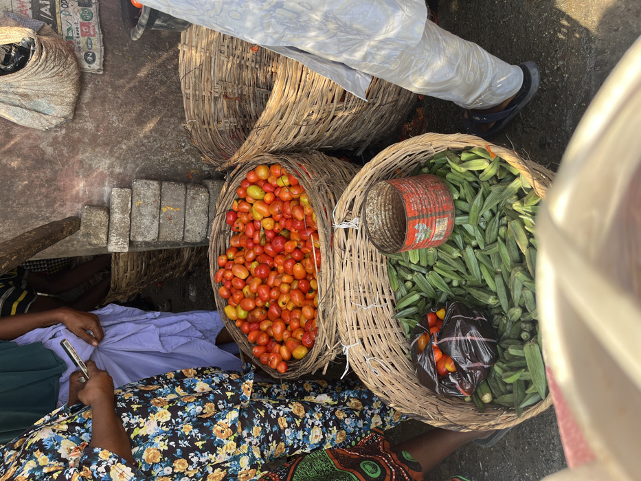 Several baskets filled with produce dominate the image. One basket contains a vibrant pile of red and yellow tomatoes. Another holds green okra and a rusty, open tin can sits inside. A small bag of tomatoes is also placed among the okra. Other baskets, partially visible, appear empty or covered. People stand or sit nearby, wearing colorful clothing and light-colored trousers. A mobile phone is also visible. The scene takes place on a paved surface, potentially a market or roadside.