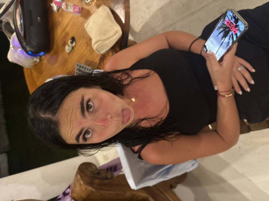 A forensic analysis identifies a candid, eye-level photograph of a female individual taken in Pecatu, Indonesia, within an illuminated outdoor or semi-outdoor environment, likely at night. The subject has dark, damp-appearing hair and displays a playful expression with her tongue extended and eyes directed towards the camera. Her face, specifically the nose and upper cheeks, and her upper chest exhibit erythema consistent with sunburn. She is dressed in a black spaghetti-strap tank top, a gold-colored necklace with a small pendant, a red string bracelet, a gold-colored bracelet, and a ring on her left ring finger. She holds a clear-cased smartphone horizontally across her lap; its screen displays an image of a palm tree and the word 'REELZ'. To the left of the subject, a carved wooden chair draped with purple fabric and a white structural column are partially visible. To the right, a round wooden table is laden with a black portable speaker emitting a blue light, a light-colored woven pouch, a small pink bottle, and a set of keys on a ring. The visible floor is light-colored concrete or tile.