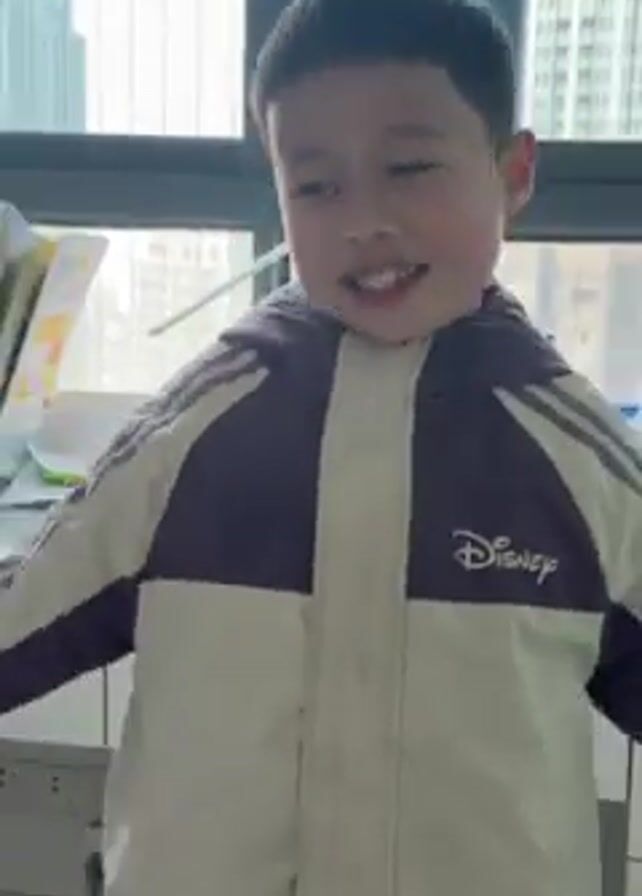 A young Asian boy wearing a white and purple Disney jacket dances in a room with a white desk, drawers, books, and papers. He makes various hand gestures and facial expressions while moving to music not heard in the video. Behind him is a window overlooking tall buildings. The room appears to be a child's bedroom or study area.
