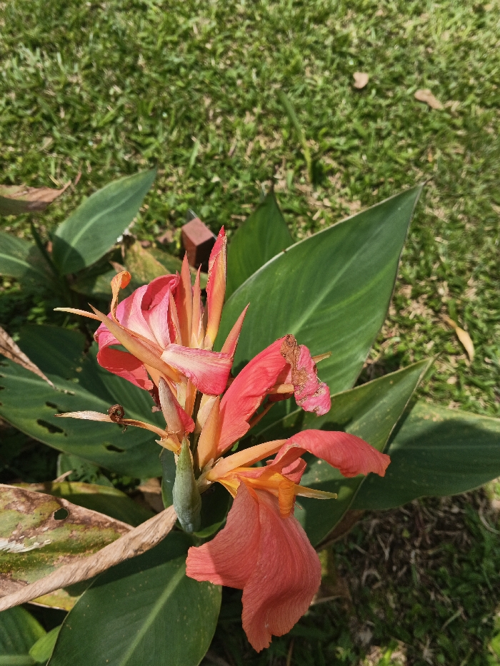 A vibrant red and orange canna lily blooms amidst broad, green leaves. The flower displays a mix of fresh and fading petals, with a few showing signs of browning edges. The plant sits in an outdoor setting, surrounded by a well-maintained lawn. The sunlight emphasizes the textures and colors of both the flower and its surroundings.