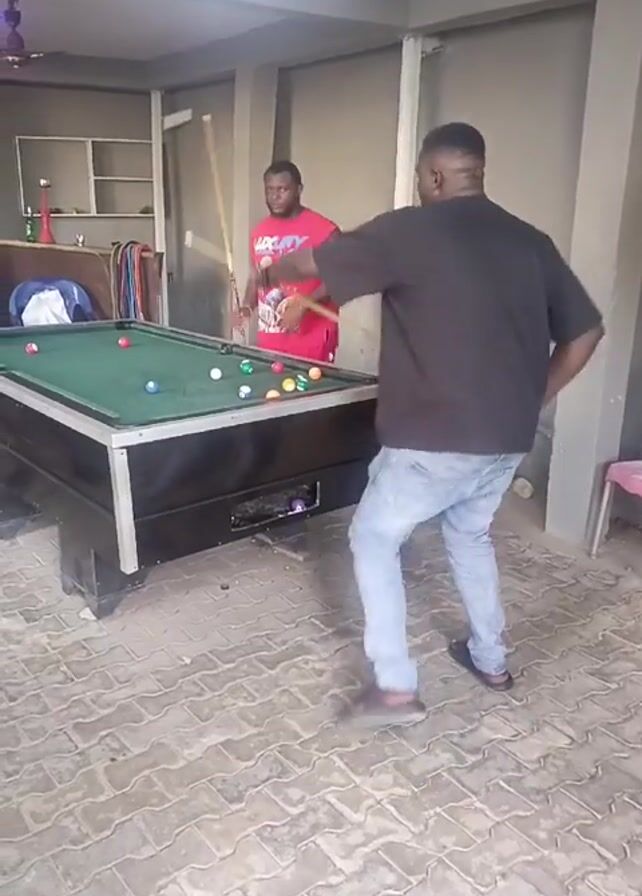 In a brightly lit indoor space, two men are engaged in a game of pool, with a third man observing. The man in the foreground, wearing a black shirt and blue jeans, lines up his shot, while the other man, clad in a red shirt with a graphic print, stands by the side of the pool table, holding a cue. The pool table, a black-framed structure with a green felt surface, is surrounded by a collection of colorful pool balls. Behind the players, a seating area with a table and a partially visible man seated at it can be seen. The floor is covered with a textured pattern of light gray tiles. The room is supported by columns, and a shelf unit against one wall is filled with various objects.