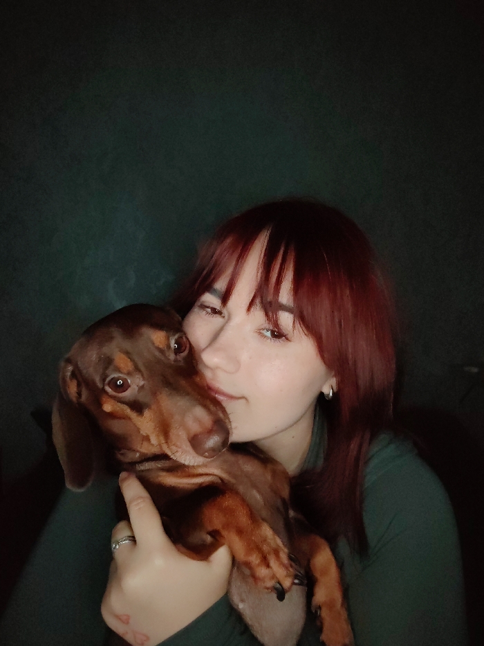 - "A woman with auburn hair and bangs is cradling a brown dachshund" by FM-9vPRQ2, licensed under CC BY 4.0