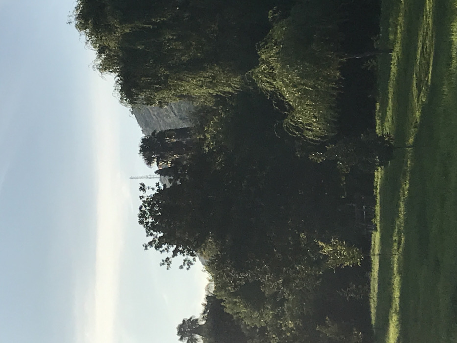 A landscape view features dense foliage on the right, transitioning to a bright, hazy sky on the left. Through a break in the trees, a tall structure resembling a building or tower is partially visible. A mountain-like form can be seen in the distance, adding depth to the scenery. The foreground shows a well-maintained lawn.