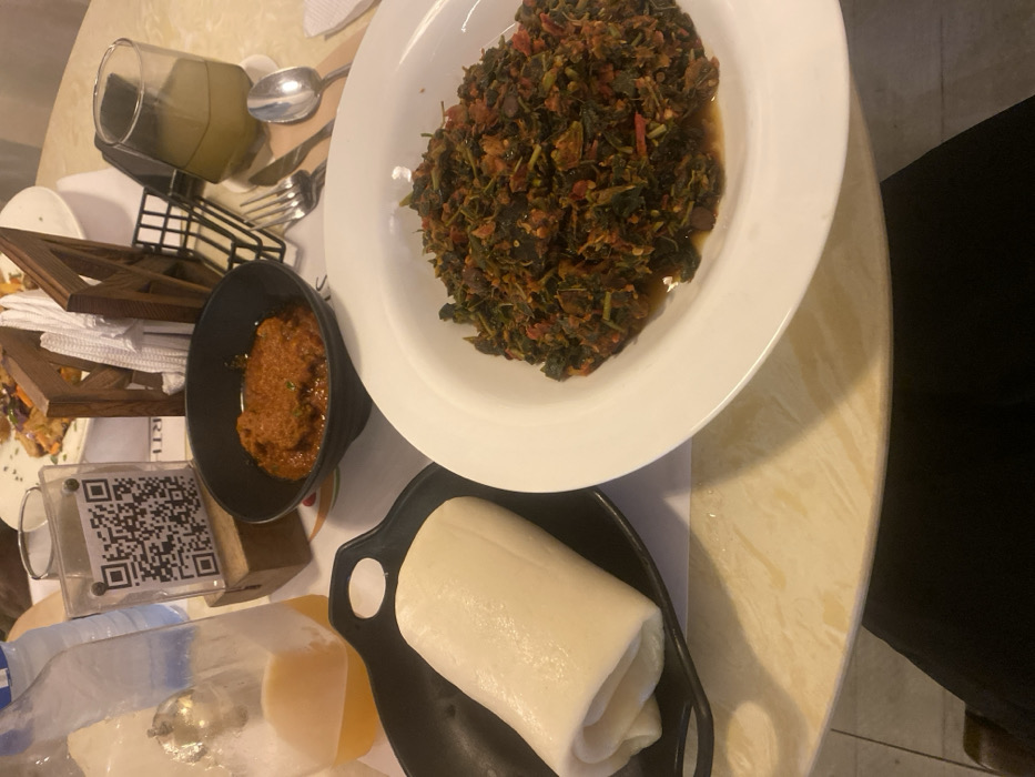 The scene depicts an indoor dining table at a restaurant in Links Reservation, Nigeria. The light-colored, subtly veined table surface is laden with a meal. In the foreground, a large white plate contains a substantial portion of dark green leafy stew, interspersed with reddish and dark chunky ingredients. To its left, a black oval dish holds a smooth, light-colored, rolled dough-like food item. Centered behind these is a smaller black bowl filled with a reddish-orange, textured sauce or stew. Further into the background, a clear glass bottle partially filled with an amber liquid stands next to a clear acrylic display holding a black QR code on a wooden base. A wooden napkin holder with white napkins and a black wire basket are also visible. To the right, cutlery, including a fork, knife, and spoon, is arranged next to a glass tumbler containing a greenish-yellow liquid. The lower edge of the image reveals the dark-trousered legs of a person seated at the table.