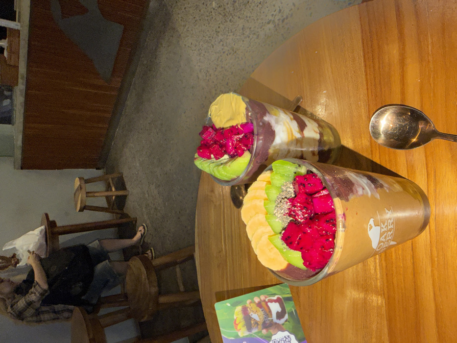 This image depicts an interior scene at an Oak Berry cafe in Ubud, Indonesia. In the foreground, two clear plastic cups containing layered acai or smoothie bowls are positioned on a polished light brown wooden table. The cup on the left, bearing the "OAK BERRY" logo, is topped with sliced bananas, sliced kiwi, diced red dragon fruit, and chia seeds. The cup on the right is topped with sliced avocado, diced red dragon fruit, and a scoop of a light yellow substance, consistent with peanut butter. A silver spoon rests beside each cup on the table. To the left, a promotional card featuring a food image and a QR code is partially visible. In the midground, a person with light-colored hair, wearing a plaid shirt, denim shorts, and flip-flops, stands facing away from the viewer. They are holding a black shoulder bag and a white bag or item. This individual is positioned next to a tall, round wooden table and two wooden stools. The background reveals a wooden counter facade running horizontally across the frame and a dark gray concrete floor.