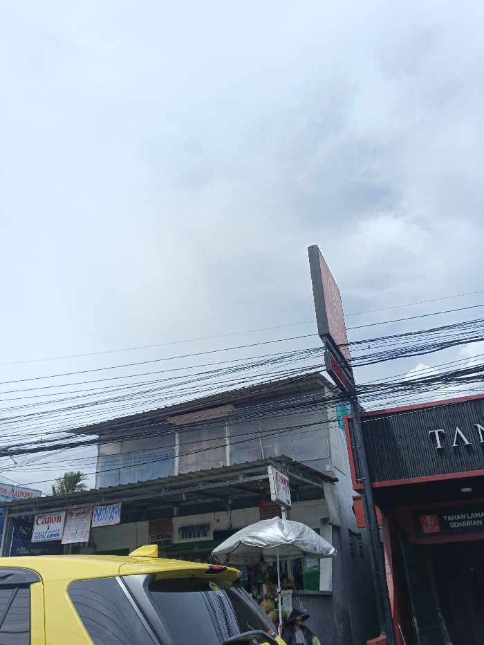 A cloudy sky looms above a commercial area. Buildings are visible, some with signage indicating businesses like laundry and photo services. Overhead, a web of electrical wires crisscrosses. A yellow car is parked in the foreground, partially obscuring the scene. A street vendor sits under an umbrella.