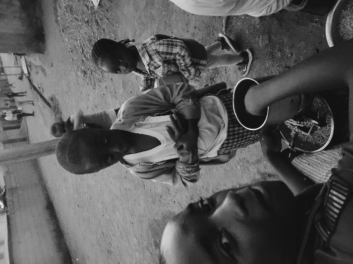 Three children appear in the black and white image. A younger child in a plaid shirt stands near the back. An older child stands with crossed arms. Another older child is visible near the bottom of the frame. There is a pot visible on the right side of the frame and it appears to have food inside. The photo may have been taken outdoors based on the dirt and building background.