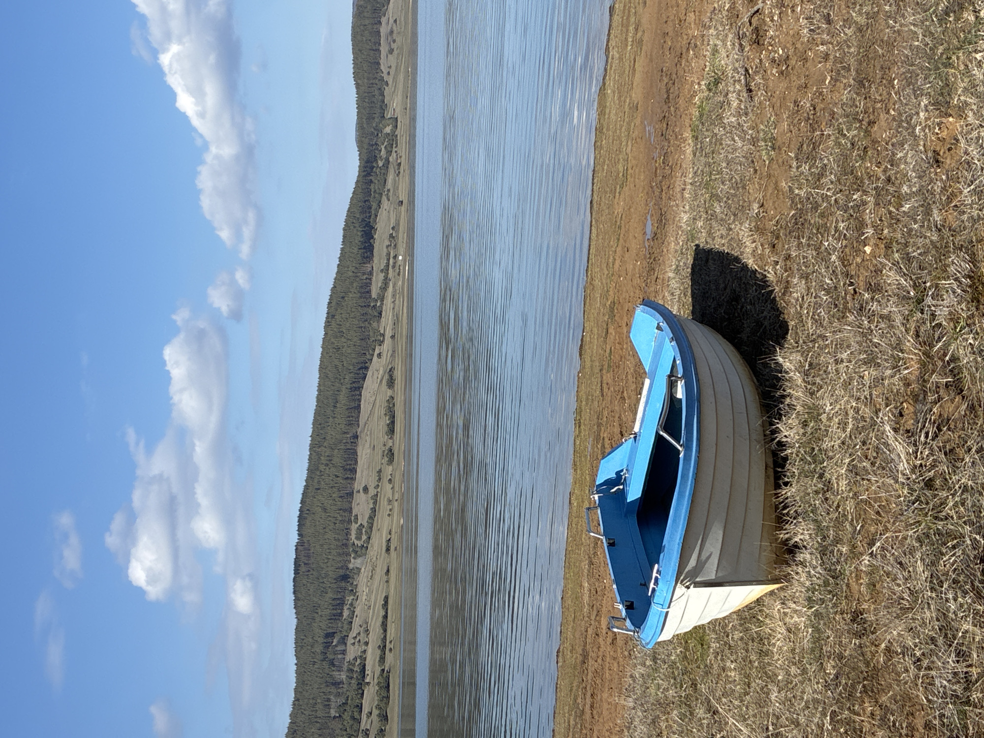 This image depicts a landscape at Цигов чарк, Bulgaria, featuring a small boat on a lake shore under a clear, partly cloudy sky. The foreground shows dry, sparse, yellowish-brown grass transitioning to reddish-brown soil near the water's edge. A white and light blue rowboat, approximately 3-4 meters in length, rests on this dry ground, facing slightly left. The boat's hull is white, while its interior and gunwale are light blue. Silver-colored metal fittings, likely grab handles or cleats, are visible on the boat's interior near the stern and bow. A dark shadow extends from the boat to its right, indicating a light source from the left. The midground is dominated by a calm body of water, likely Batak Reservoir, displaying a blue-grey surface with subtle horizontal ripples. The far shore and background consist of gently rolling hills covered in a mixture of light brown, dry vegetation and dense evergreen forest. No people, actions, or interactions are visible. The environment suggests a sunny day with calm conditions.