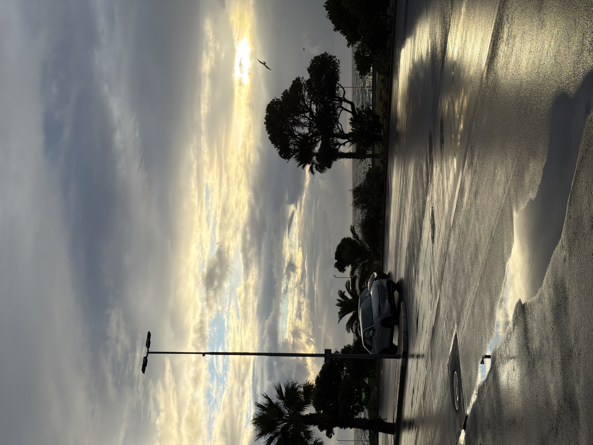 A street scene near the ocean on a cloudy day, likely after a rain shower. A silver or light-colored car is parked along the side of the street. A tall street light stands upright along the street. The ground is wet, and puddles reflect the sky. Palm trees and other silhouetted trees are visible along the coast. In the distance, water meets the horizon under a cloudy sky. A bird is flying in the sky. This location could be in Cape Town, South Africa, given its coastline and the presence of palm trees.
