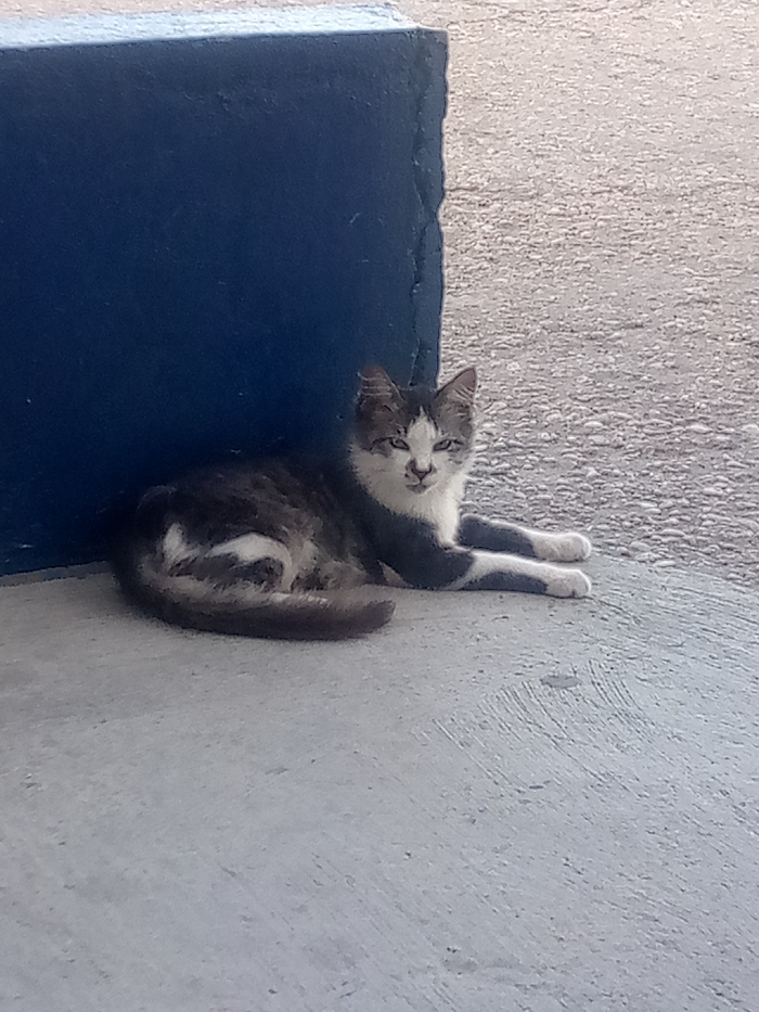 - "A gray and white cat rests on a concrete surface, leaning against a dark blue structure" by FM-Q5qB73, licensed under CC BY 4.0
