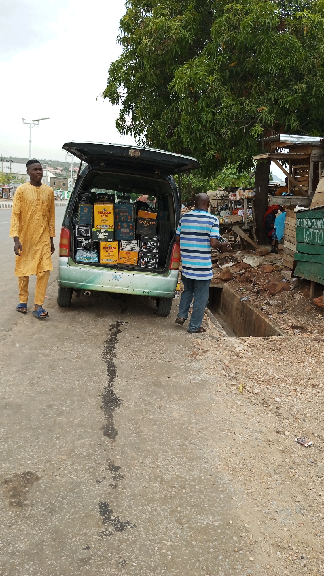 car parked on a street in Zango-ndaji, Nigeria. The car's trunk is open and filled with boxes of alcoholic beverages. A man in a yellow outfit stands to the left of the car, while another man in a striped shirt stands to the right, near a drainage ditch and a wooden stall with the sign "GOLDEN-CHANCE LOTTO." A large tree is visible in the background, and the overall environment appears to be a roadside market or commercial area. The road shows evidence of water damage.