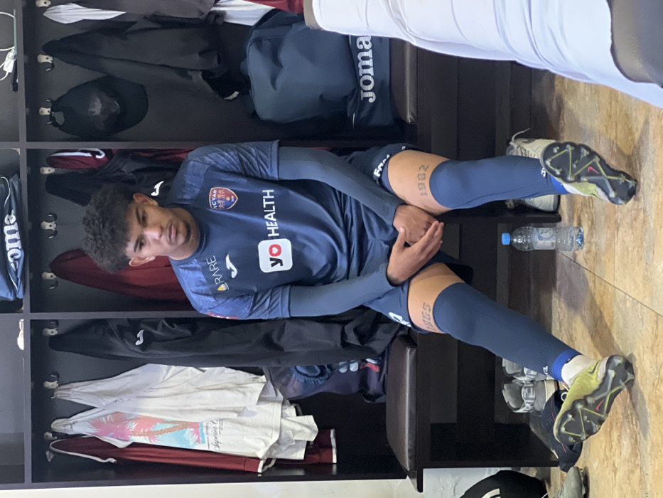 A young male soccer player is seated on a dark brown padded bench within a locker room or changing facility in Charentsavan, Armenia, associated with FC Van