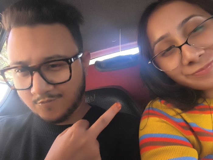 The image depicts two individuals inside a vehicle, located in Kolkata, India. The male subject is positioned on the left, slightly forward, wearing dark-rimmed rectangular glasses, a dark crew-neck shirt, and has a short beard. He is pointing his right index finger towards the right side of the frame; the tip of this finger shows an orange residue. The female subject is positioned on the right, wearing light-rimmed oval glasses and a horizontally striped sweater with yellow, blue, red, and brown bands. She has dark hair, a subtle smile, and is looking towards the camera. The vehicle's interior features a red seat back and a dark headrest visible behind the subjects. Natural light illuminates the scene, suggesting daytime.