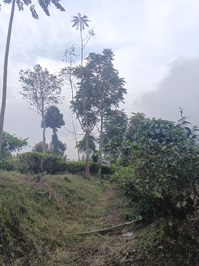 The image displays an outdoor, sloping natural landscape in the highlands of Dalat, Vietnam, consistent with a tea or coffee plantation area. The sky is overcast with a uniform light gray cloud cover. The foreground consists of a downward-sloping earthen path, densely covered with mixed green grasses, weeds, and dried vegetation. A single light-colored, thin wooden branch or pipe lies horizontally across the ground in the lower-middle of the frame. To the right, a significant portion of the mid-ground is occupied by dense, dark green cultivated bushes with small, glossy leaves, characteristic of tea or coffee plants. In the mid-ground and background, multiple tall trees with varying foliage patterns rise against the cloudy sky. One particularly tall, slender tree with sparse, distinctive leaves tops a group of trees near the center. No individuals, animals, or constructed objects other than the potential branch/pipe are visible.