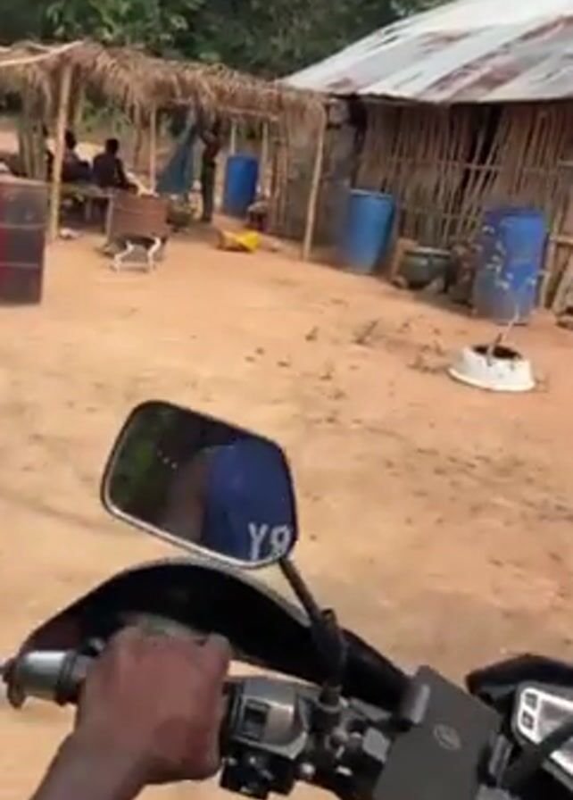 The video begins from the perspective of someone sitting on a motorcycle, facing a yard. In the yard there is a group of people sitting or standing under a thatched roof structure. To the right of this is a building constructed of sticks with a metal roof. There are several blue plastic drums scattered around the yard. A white dog is also visible. The camera moves forward, showing a dirt yard with green leaves scattered on the ground and several structures made of sticks. There are trees and green vegetation in the background.