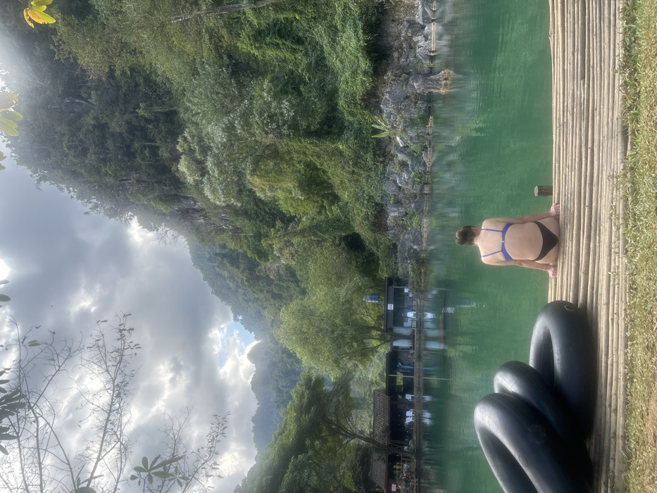 A woman in a swimsuit sits on a bamboo raft, facing a serene, green-tinted lake. Lush, green cliffs rise steeply, framing the scene under a cloudy sky. Several black inner tubes are stacked on the raft. In the distance, floating structures line the water's edge. The photograph captures a tranquil moment surrounded by natural beauty.
