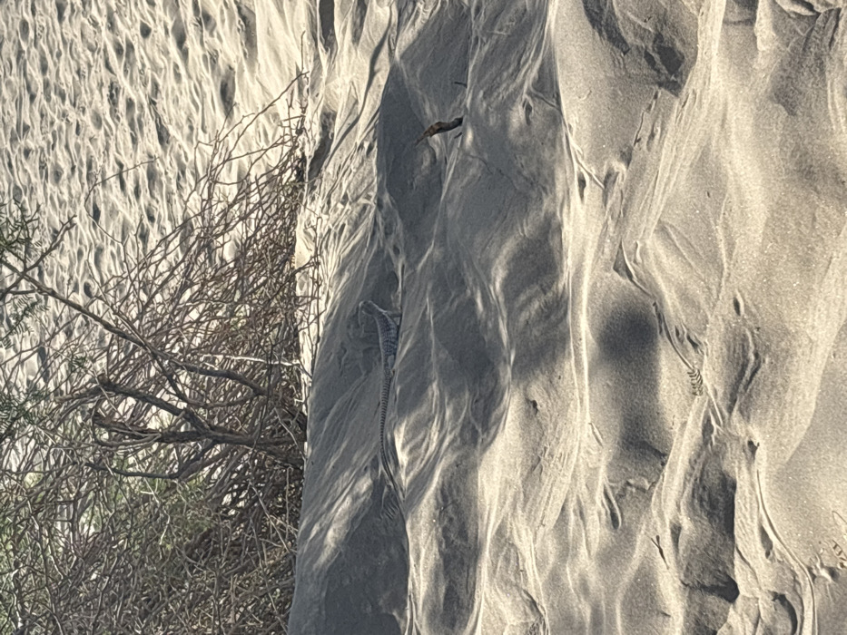 A desert-like environment in the city of Unknown, United States, is depicted under natural light. The foreground and midground consist of extensive, light-colored sand dunes with distinct ripple patterns and shadows. A single lizard, approximately 12-18 inches in length including its tail, is positioned on a sand ridge in the midground, facing right. The lizard exhibits a patterned back in shades of grey and tan, and its head is slightly elevated, suggesting an alert posture. No human subjects are present. In the background, a dense, leafless shrub or small tree composed of numerous intertwined dry branches is visible, casting additional shadows onto the sand. Several small pieces of dried wood or sticks are partially buried in the sand in the mid-to-far ground. No discernible interactions or specific actions beyond the lizard's stationary presence are evident.