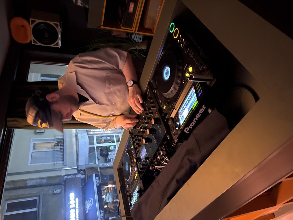 A male DJ is actively operating a professional DJ setup within a dimly lit interior space, overlooking a street scene in Sofia, Bulgaria