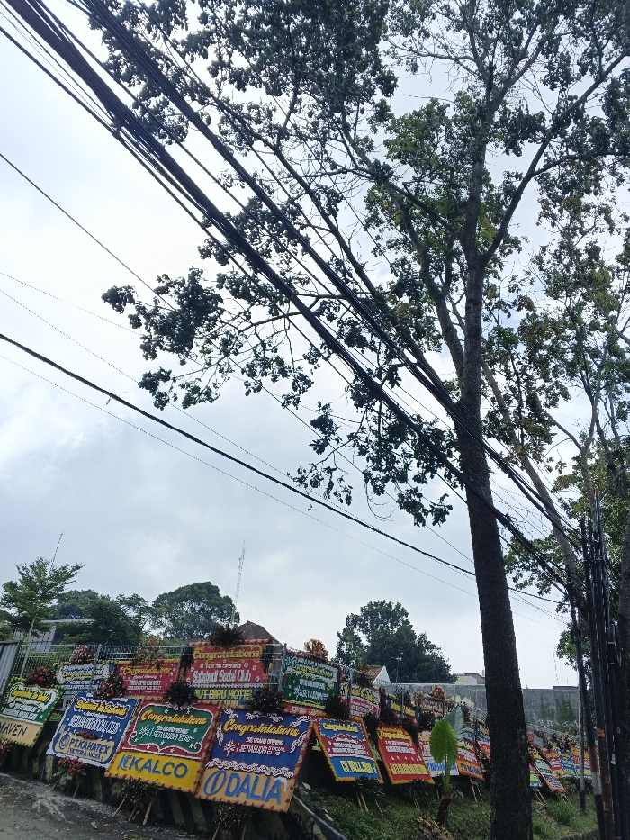A street scene shows many congratulatory flower arrangements lining a roadside slope. Trees with leafy branches are overhead, intertwined with power lines against a cloudy sky. Some buildings and a fence are visible in the background, behind the flowers. The overall impression is a busy street with celebratory decorations.