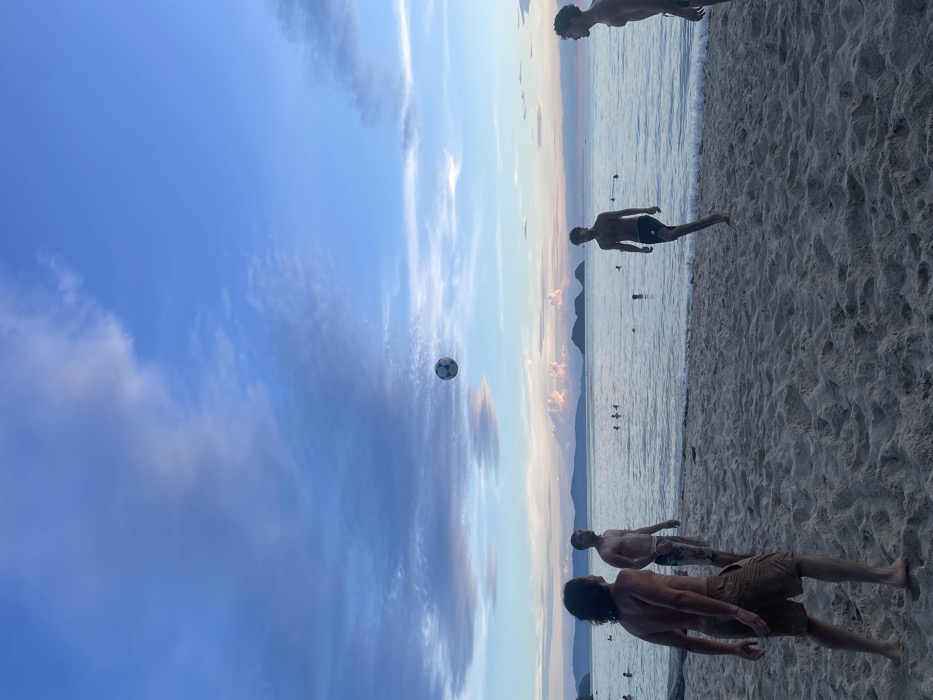 The scene depicts a beach in Baan Sri Thanu, Thailand, at dusk. Four adult males are on the sandy beach in the foreground, all shirtless and wearing shorts. A black and white soccer ball is suspended in the air above the ocean, positioned slightly left of center in the frame. From left to right: 1. A male with dark, shoulder-length hair stands with his back mostly to the camera, wearing light brown shorts. His left leg is slightly forward, and he appears poised for movement. 2. A male with short dark hair and a light beard stands facing towards the ocean, wearing patterned light-colored shorts. He is looking slightly upwards and to his left. 3. A male with short dark curly hair stands facing towards the ocean, wearing dark shorts. His left leg is lifted, with the foot slightly off the ground, suggesting active movement or anticipation. 4. A male with dark curly hair is partially visible on the far right edge of the frame, facing towards the other individuals, also wearing dark shorts. The beach consists of light-colored sand with visible footprints and undulations. A light-colored log lies horizontally on the sand near the lower-left. Beyond the beach, the calm ocean extends to the horizon. Several individuals are visible swimming or wading in the water in the mid-ground. Distant islands or landmasses are silhouetted against the horizon, which features a strip of faint orange and pink light beneath a vast sky transitioning from deep blue overhead to lighter blues and purples. Scattered clouds are present throughout the sky.
