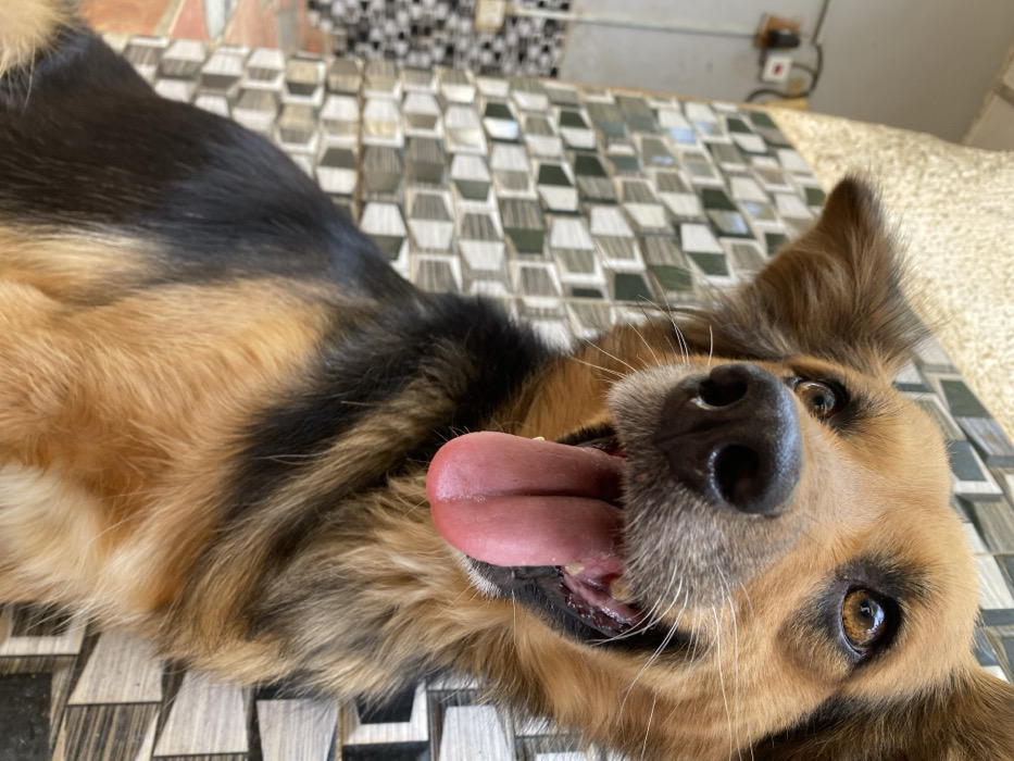 - "An upward-angled close-up depicts a medium-sized dog with a black and tan coat, positioned against a tiled wall in Takau, Nigeria" by FM-v68Gl1, licensed under CC BY 4.0