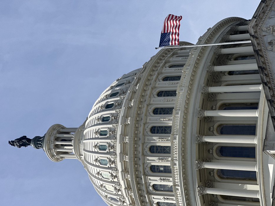 The image displays the upper sections of the U.S. Capitol Building's dome and an American flag against a clear blue sky, located in Washington, D.C., United States of America. The primary subject is the large, white Neoclassical dome. At its apex stands the bronze Statue of Freedom, surmounting a tholos structure comprised of columns and an entablature. Below this, the main dome surface is segmented by vertical architectural ribs and features a series of recessed, ornamental panels. Beneath the dome is a circular drum, encircled by a balustrade and a colonnade of Corinthian columns. Between these columns are arched windows with dark panes. The lower visible portion of the building’s facade, below the dome’s drum, also features decorative relief work. To the right of the dome, an American flag is mounted on a tall, slender flagpole. The flag, displaying red and white stripes and a blue canton with white stars, is unfurled and waving slightly to the right, indicating a gentle breeze. The overall environment is illuminated by bright daylight, with the sky appearing a uniform light blue, absent of significant cloud cover. No individuals are visible in the scene.