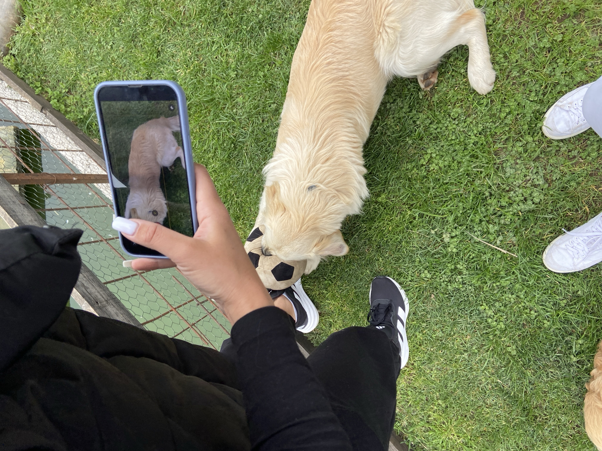 - "A person is taking a photo with their smartphone of a golden retriever playing with a black and white soccer ball on a grassy lawn" by FM-rv1Bv1, licensed under CC BY 4.0