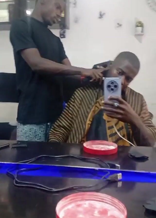 Two men are in a barbershop. One man, wearing a black t-shirt and patterned shorts, stands and uses a hair clipper to trim the back of the neck of the other man who is seated. The seated man wears a striped robe and is holding a smartphone in his hand, facing the camera, apparently taking a selfie. A mirror reflects the scene. On the table in front of the seated man are two red circular lids, a USB cable, a comb, and other small items. In the background, there is a cabinet with products and decorations on the wall. There is also a clock on the wall. The audio includes music.